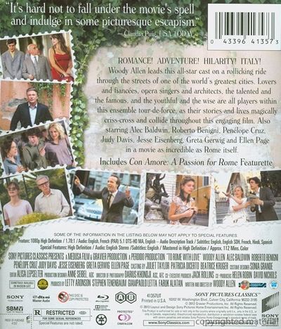 Romance! Adventure! Hilarity! Italy! Woody Allen leads this all-star cast on a rollicking ride through the streets of one of the world's greatest cities. Lovers and Fiancées, Opera Singers and Architects, the talented and the famous, and the youthful and the wise are all players within this ensemble tour-de-force, as their stories and lives magically criss-cross and collide throughout this engaging film. Also starring Alec Baldwin, Roberto Benigni, Penélope Cruz, Judy Davis, Jesse Eisenberg, Greta Gerwig and Ellen Page in a movie as incredible as Rome itself. |