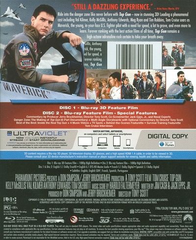 Blu-ray 3D Feature Film Blu-ray Feature Film Special Features: Commentary By Producer Jerry Bruckheimer, Director Tony Scott, Co-Screenwriter Jack Epps, Jr., and Naval Experts Danger Zone: The Making of Top Gun - 6 Part Documentary Multi Angle Storyboards With Optional Commentary By Director Tony Scott Best Of The Best: Inside the Real Top Gun 4 Music Videos TV Spots Behind The Scenes Featurette Survival Training Featurette Tom Cruise Interview Digital Copy Of Feature Film Included |