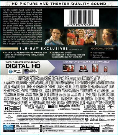 Two-time Academy Award®-winner Ron Howard delivers the exhilarating true story of a legendary rivalry that rocked the world. During the sexy and glamorous golden age of Formula 1 racing, two drivers emerged as the best: gifted English playboy James Hunt (Chris Hemsworth, The Avengers) and his methodical, brilliant Austrian opponent, Niki Lauda (Daniel Brühl, Inglourious Basterds). As they mercilessly clash on and off the Grand Prix racetrack, the two drivers push themselves to the breaking point of physical and psychological endurance, where there's no shortcut to victory and no margin for error. Co-starring Olivia Wilde (Tron: Legacy), it's the heart-racing, epic, action-drama that critics are calling "one of the best movies of this, or any, year" (Pete Hammond, Movieline).