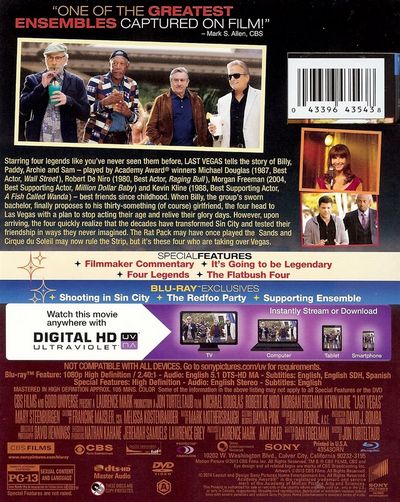 Starring four legends like you've never seen them before, Last Vegas tells the story of Billy, Paddy, Archie and Sam - played by Academy Award winner Michael Douglas (1987, Best Actor, Wall Street), Robert De Niro (1980, Best Actor, Raging Bull), Morgan Freeman (2004, Best Supporting Actor, Million Dollar Baby) and Kevin Kline (1988, Best Supporting Actor, A Fish Called Wanda) - best friends since childhood. When Billy, the group's sworn bachelor, finally proposes to his thirty-something (of course) girlfriend, the four head to Las Vegas with a plan to stop acting their age and relive their glory days. However, upon arriving, the four quickly realize that the decades have transformed Sin City and tested their friendship in ways they never imagined. The Rat Pack may have once played the Sands and Cirque du Soleil may now rule the Strip, but it's these four who are taking over Vegas.