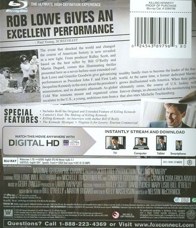 Based on Bill O'Reilly and Martin Dugard's best seller comes this shocking thriller starring Rob Lowe and Ginnifer Goodwin. As John F. Kennedy (Lowe) rises to become U.S. president, a former Marine grows disillusioned with America. When their paths ultimately cross, the course of history is changed forever as seen in this mesmerizing film about the assassination of JFK -- and its chilling aftermath. |