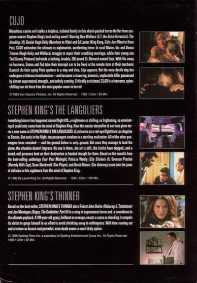 Something bizarre has happened abourd flight #29...a nightmare so chilling, so frightening, so unrelenting it could only come from the mind of Stephen King. Now the master storyteller of our time gives terror a new name in THE LANGOLIERS. A jet leaves on a red-eye flight from Los Angeles to Boston. But early in the flight, ten passengers awaken to a startling realization: All of the other passengers have vanished - and the ground below is only...ground. But once they manage to land the plane, the situation doesn't improve. No one is there...the air is still...the clocks have stopped...and a dread, evil presence bent on their destruction is headed straight for them. Based on the novella from the best-selling anthology Four Past Midnight, Patricia Wettig (City Slickers II), Bronson Pincho (Beverly Hills Cop), Dean Stockwell (The Player), and David Morse (The Getaway) stare into the jaws of oblivion in this nightmare from the mind of Stephen King.