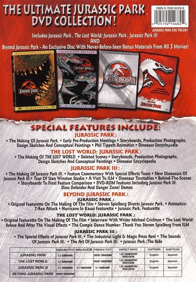 Box Set Includes: Jurassic Park I, II, III & Bonus Features Disc "Beyond Jurassic Park". These movies not sold individually. All discs and Packaging are in excellent condition.