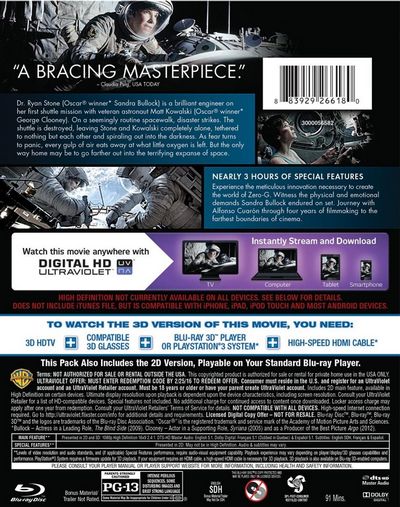 3D Blu-ray Presentation -Blu-ray Presentation -Special Features Exclusive to the Blu-ray Presentation: A) Gravity: Mission Control (Hi-Definition, 1:46:36) This feature-length behind the scenes documentary is incredibly in-depth. It covers everything about the film's inception and production. Watch it all in one sitting, via Play All, or by individually accessible chapters: ◦It Began with a Story ◦Initial Challenges: Long Shots and Zero G ◦Previsualizing Gravity ◦The Hues of Space ◦Physical Weightlessness ◦Space Tech ◦Sandra and George: A Pair in Space ◦Final Animation ◦Complete Silence B) Shot Breakdowns (Hi-Definition, 36:48). A look at how and why certain CGI props, costumes, and sets were built. There's also a great part where Steven Price shows how he used music to replace the sound effects. Just like before, you can Play All, or select individually accessible chapters : ◦Behind The Visor ◦Fire in the International Space Station ◦Dr. Stone's Rebirth ◦The Sound of Action in Space ◦Splashdown C) Film Festivals (Hi-Definition). A list of all the film festivals in which 'Gravity' was an official selection. -The following Features Are Available in Hi Definition on the Blu-ray and Standard Definition on the DVD Versions of the Film: A) Collision Point: The Race to Clean Up Space (Hi-Defintion, 22:28 ) Ed Harris narrates this documentary about the millions of pieces of man-made debris currently orbiting the Earth and the possibilities of something like that which occurs in the movie, really happening. There's also an interview with Don Kessler, the man whose Kessler Syndrome theory inspired the filmmakers to make the movie. This documentary is fascinating and really grounds this movie's big "What if?" They even discuss what inspired the idea for "The Russians" shooting their own satellite out of the sky." B) B) •'Aningaaq' (Hi- Definition, 10:11) A short film by movie co-writer Jonás Cuarón that shows the other side of Dr. Stone's radio conversation when she is alone in the Soyuz. This Greenland-set short, which debuted online a few months ago, can be played with or without an introduction by Jonás and Alfonso Cuarón. -DVD (Widescreen) Presentation -Special Features on the DVD Version of the Film: A) C) Collision Point: The Race to Clean Up Space (Standard Defintion, 22:28 ) Ed Harris narrates this documentary about the millions of pieces of man-made debris currently orbiting the Earth and the possibilities of something like that which occurs in the movie, really happening. There's also an interview with Don Kessler, the man whose Kessler Syndrome theory inspired the filmmakers to make the movie. This documentary is fascinating and really grounds this movie's big "What if?" They even discuss what inspired the idea for "The Russians" shooting their own satellite out of the sky." (Also available in Hi-Definition on the Blu-ray Disc.) B) •'Aningaaq' (Standard Definition, 10:11) A short film by movie co-writer Jonás Cuarón that shows the other side of Dr. Stone's radio conversation when she is alone in the Soyuz. This Greenland-set short, which debuted online a few months ago, can be played with or without an introduction by Jonás and Alfonso Cuarón. (Also available in Hi-Definition on the Blu-ray Disc.) |