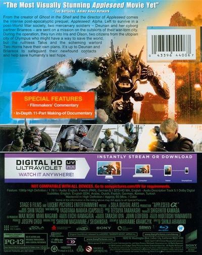 Based on the comic book by the creator of Ghost in the Shell, a young female soldier Deunan and her cyborg partner Briareos survive through the post World War 3 apocalyptic New York in search of human's future hope, the legendary city of Olympus. |