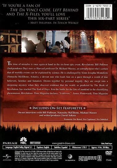 From executive producer Gavin Polone (""Panic Room"") and writer/creator David Seltzer (""The Omen"") comes ""Revelations,"" a six-hour event series starring Bill Pullman (""Independence Day"") as Harvard professor Dr. Richard Massey, an astrophysicist who is certain that all worldly events can be explained by Science. In the series premiere, Dr. Massey is dealing with the tragic murder of his 12-year-old daughter by a maniacal murderer, Isaiah Haden (Michael Massee, ""24""), who was captured and imprisoned. After a strange course of events, Massey is challenged by a nun, Sister Josepha Montafiore (Natascha McElhone, ""Solaris""), who leads him on a journey through the unfamiliar world of faith. Drawn together by personal tragedy, these unlikely partners -- one who worships God and one who worships Science -- are propelled into a deepening mystery, finding evidence that the world, as predicted by The Book of Revelation, has reached The End of Days.