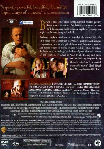 Beware the low men. Bobby Garfield couldn't possibly know what that means. But before the summer is over, he'll know... and he'll summon depths of courage and forgiveness he never imagined he had. Anthony Hopkins headlines this nostalgically atmospheric film set in small-town Connecticut in 1960. He portrays Ted Brautigan, a mysterious, psychically gifted loner who becomes a mentor and father figure to Bobby (Anton Yelchin) when he enlists the boy's help in eluding the shadowy figures who seek control of Ted's powers. Directed by Scott Hicks (Shine) and based on the book by Stephen King, Hearts In Atlantis is "a wonderful, wonderful movie" (Joel Sigel, Good Morning America/ ABC-TV). |