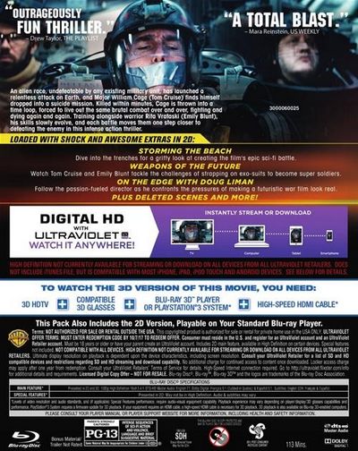 Lt. Col. Bill Cage (Cruise) is an officer who has never seen a day of combat when he is unceremoniously demoted and then dropped into combat. Cage is killed within minutes, managing to take an alpha alien down with him. But he awakens back at the beginning of the same day and is forced to fight and die again... and again - as physical contact with the alien has thrown him into a time loop. |