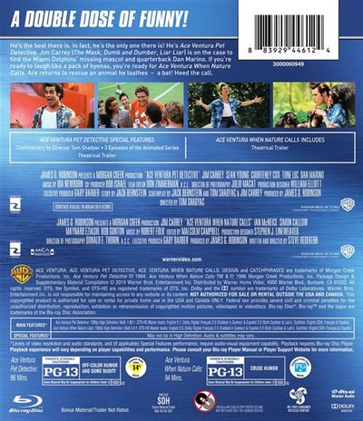 Ace Ventura: Pet Detective He's the best there is, in fact, he's the only one there is! He's Ace Ventura Pet Detective. Jim Carrey (The Truman Show, The Mask, Liar Liar) is on the case to find the Miami Dolphins' missing mascot and quarterback Dan Marino. He goes eyeball to eyeball with a man-eating shark, stakes out the Miami Dolphins and woos and wows the ladies. Whether he's undercover, under fire or underwater, he always gets his man...or beast. Ace Ventura: When Nature Calls Africa's the place and Ace is on the case, setting out to rescue an animal he loathes: a bat! |