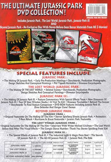 Jurassic Park: Direct Hotlink to the Set of Jurassic Park III The Making of Jurassic Park Early Pre-Production Meetings Storyboards, Production Photographs, Design Sketches and Conceptual Paintings Phil Tippett Animatics: Raptors in the Kitchen Theatrical Trailers: Jurassic Park, The Lost World, Jurassic Park III Dinosaur Encyclopedia Production Notes Cast & Filmmakers DVD-ROM Features including Live Web Events The Lost World: Jurassic Park: Direct Hotlink to the Set of Jurassic Park III The Making of The Lost World Deleted Scenes Storyboards, Production Photographs, Design Sketches and Conceptual Paintings Theatrical Trailers: Jurassic Park, The Lost World, Jurassic Park III Dinosaur Encyclopedia Production Notes Cast & Filmmakers DVD-ROM Features including Live Web Events Jurassic Park III: The Making of Jurassic Park III Feature Commentary with Special Effects Team The New Dinosaurs of Jurassic Park III Tour of Stan Winston Studio A Visit to ILM: Witness 20 Different Stages in an Exclusive Rare Step-by-Step Look at the Computer Graphics Created by ILM Dinosaur Turntables: A Spectacular Three Dimensional Look at the 12 Dinosaurs Created for the Film Behind-the-Scenes Storyboards to Final Feature Comparisons The Jurassic Park III Archives Theatrical Trailers Montana: Finding New Dinosaurs: A Special Visit to Paleontologist Jack Horner's Dinosaur Dig with Never-Before-Seen Footage DVD-ROM Features Including Jurassic Park III Dino Defender and Danger Zone! Game Demos Beyond Jurassic Park: Jurassic Park: Original Featurette on the Making of the Film Steve Spielberg Directs Jurassic Park Animatics: T-Rex Attack Hurricane in Kauai Featurette Jurassic Park Featurette The Lost World: Jurassic Park: Original Featurette on the Making of The Film Interview with Writer Michael Crichton The Lost World: Before and After the Visual Effects The Compie Dance Number: Thank You Steven Spielberg from ILM Jurassic Park III: The Special Effects of Jurassic Park III The Industrial Light & Magic Press Reel The Sounds of Jurassic Park III The Art of Jurassic Park III Jurassic Park: The Ride |