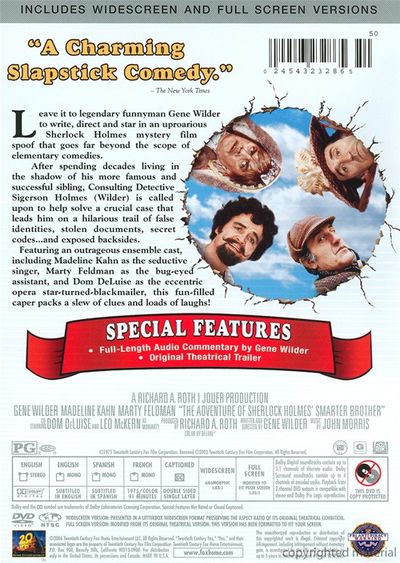 After spending decades living in the shadow of his more famous and successful sibling, Consulting Detective Sigerson Holmes (Wilder) is calle dupon to help solve a crucial case that leads him on a hilarious trail of false identities, stolen documents secret codes... and exposed backsides. |