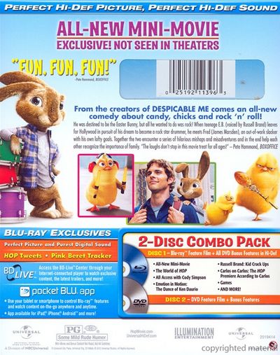 From the makers of Despicable Me comes an all-new comedy about candy, chicks and rock 'n' roll! He was destined to be the Easter Bunny, but all he wanted to do was rock! When teenage E.B. (voiced by Russell Brand) leaves for Hollywood in pursuit of his dream to become a rockstar drummer, he meets Fred (James Marsden), an out-of-work slacker with his own lofty goals. Together the two encounter a series of hilarious mishaps and misadventures and in the end help each other recognize the importance of family. "The laughs don't stop in this movie treat for all ages!" Pete Hammond, Boxoffice |