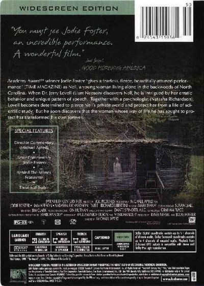 Nell is a girl who's been brought up in an isolated world. The only people she knew were her mother and twin sister. They lived together in a cottage in the forest. Nobody has ever met Nell. After her mother's death, she's discovered by the local doctor Jerome. He's fascinated by her, since she speaks a mangled language, developed by her sister and herself growing up, "twin speak" if you will. But Paula, a psychology student, wants her observed in a laboratory. The judge decides they get three months to observe her in the forest, after which he'll decide about Nell's future. |