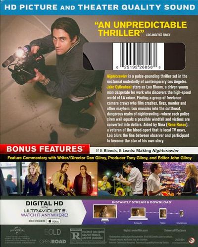 Nightcrawler is a pulse-pounding thriller set in the nocturnal underbelly of contemporary Los Angeles. Jake Gyllenhaal stars as Lou Bloom, a driven young man desperate for work who discovers the high-speed world of L.A. crime. Finding a group of freelance camera crews who film crashes, fires, murder and other mayhem, Lou muscles into the cut-throat, dangerous realm of nightcrawling - where each police siren wail equals a possible windfall and victims are converted into dollars. Aided by Nina (Rene Russo), a veteran of the blood-sport that is local TV news, Lou blurs the line between observer and participant to become the star of his own story. |