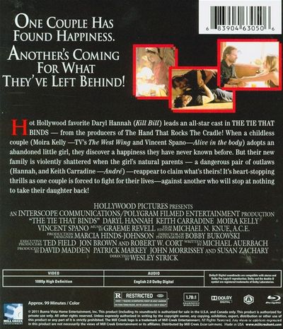 Hot Hollywood favorite Daryl Hannah (Kill Bill) leads an all-star cast in The Tie That Binds - from the producers of The Hand That Rocks The Cradle! When a childless couple (Moira Kelly - One Tree Hill and Vincent Spano - Alive) adopts an abandoned little girl, they discover a happiness they have never known before. But their new family is violently shattered when the girl's natural parents - a dangerous pair of outlaws (Hannah, and Keith Carradine -- Andre) - reappear to claim what's theirs! It's heart-stopping thrills as one couple is forced to fight for their lives - against another who will stop at nothing to take their daughter back! |