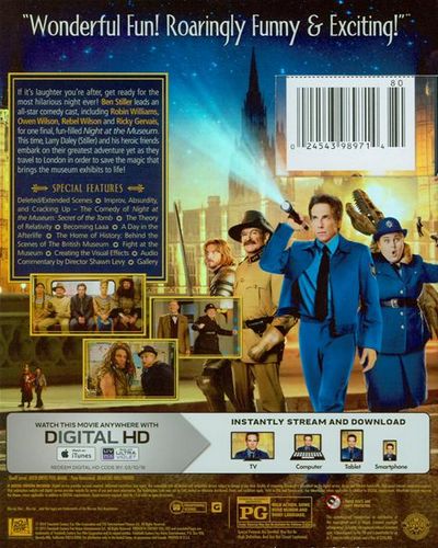If it's laughter you're after, get ready for the most hilarious night ever! Ben Stiller leads an all-star comedy cast, including Robin Williams, Owen Wilson, Rebel Wilson and Ricky Gervais, for on final, fun-filled Night at the Museum. This time, Larry Daley (Stiller) and his heroic friends embark on their greatest adventure yet as they travel to London in order to save the magic the brings the museum exhibits to life! |