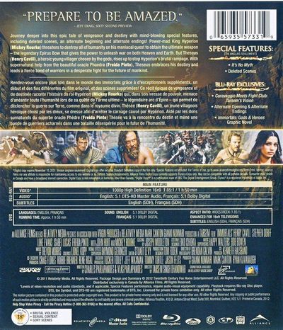 BLU-RAY FEATURE • It's No Myth • Deleted Scenes • Caravaggio Meets Fight Club: Tarsem's Vision • Alternate Opening & Alternate Endings • Immortals: Gods & Heroes Graphic Novel DVD FEATURE |