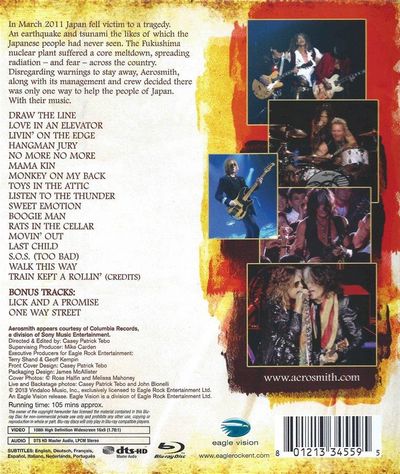 In March 2011 Japan was beset by a huge earthquake, a monstrous tsunami and the subsequent meltdown of the Fukushima nuclear plant. In the autumn of 2011, despite advice to the contrary, Aerosmith brought their Back On The Road tour to Japan, a country with which they'd always had a special relationship. The Japanese fans came out in their droves and Aerosmith responded with some of the finest gigs of their distinguished career. This film follows the band on that tour combining full length live tracks with behind the scenes footage which is at times touching and emotional and at others humorous and insightful. More than anything else it demonstrates the Japanese fans love affair with Aerosmith and their music. Track List: 1 Draw The Line 2 Love In An Elevator 3 Livin' On The Edge 4 Hangman Jury 5 No More No More 6 Mama Kin 7 Monkey On My Back 8 Toys In The Attic 9 Listen To The Thunder 10 Sweet Emotion 11 Boogie Man 12 Rats In The Cellar 13 Movin' Out 14 Last Child 15 S.O.S. (Too Bad) 16 Walk This Way 17 Train Kept A Rollin' Bonus Tracks: 18 Lick And A Promise 19 One Way Street |