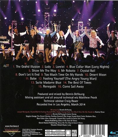 On March 18th, 2014, Dennis DeYoung, the legendary front man of Styx and author of five key songs that define that band s career, returned to Los Angeles for the first time during his solo career to play a sold out show at the El Rey Theater. Recorded live for AXS-TV and captured in pristine HD quality, the performance has been slated for release via Frontiers Records. Track List: 01. The Grand Illusion 02. Lady 03. Lorelei 04. Blue Collar Man (Long Nights) 05. Show Me The Way 06. Mr. Roboto 07. Crystal Ball 08. Don't Let It End 09. Too Much Time On My Hands 10. Desert Moon 11. Babe 12. Fooling Yourself (The Angry Young Man) 13. Suite Madam Blue 14. The Best Of Times 15. Renegade 16. Come Sail Away |