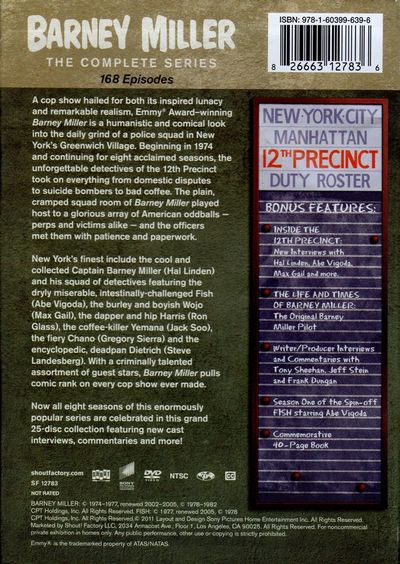 A cop show hailed for both its inspired lunacy and remarkable realism, Emmy Award-winning Barney Miller is a humanistic and comical look into the daily grind of a police squad in New York's Greenwich Village. Beginning in 1974 and continuing for eight acclaimed seasons, the unforgettable detectives of the 12th Precinct took on everything from domestic disputes to suicide bombers to bad coffee. The plain, cramped squad room of Barney Miller played host to a glorious array of American oddballs - perps and victims alike - and the officers met them with patience and paperwork.