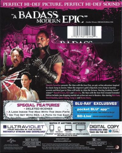Theatrical and Unrated Cuts: The Blu-ray edition of The Man with the Iron Fists features a 95-minute R-rated theatrical version and a lengthier 107-minute unrated cut, which ups the ante by 12 extra minutes. Not that it makes any difference. More indulgent than beneficial, the unrated cut simply draws out the pain. (Or the pleasure, I suppose, depending on your take.) Deleted Scenes (HD, 24 minutes): Sadly, there are only a fistful of extras. First up? Five deleted and extended scenes, among them "The Saga of Gold Lion," "Jack Knife Journey Through Wolf Mountain," "Zen Yi and Chan Make Camp," "Blacksmith Doctors Zen Yi" and "Mirror Maze." A Look Inside (HD, 2 minutes): The RZA, self-proclaimed Abbott of the Wu Tang Clan, talks about teaming up with "my boy Quentin Tarantino and Eli Roth to make a fat joint of my own" in this brief EPK. RZA is an engaging, enthusiastic host, though; so much so that I found myself wishing the disc had a fuller production documentary. On the Set with RZA (HD, 5 minutes): I had high hopes for this five-part tease. Unfortunately, it's nothing more than a series of five one-minute promos: "The Journey Begins," "Casting Legends," "Respect the Classics," "Visualizing the Story" and "First Person Shooter." A Path to the East (HD, 2 minutes): Yet another quick peek behind the scenes with RZA. My Scenes Bookmarking DVD Copy |