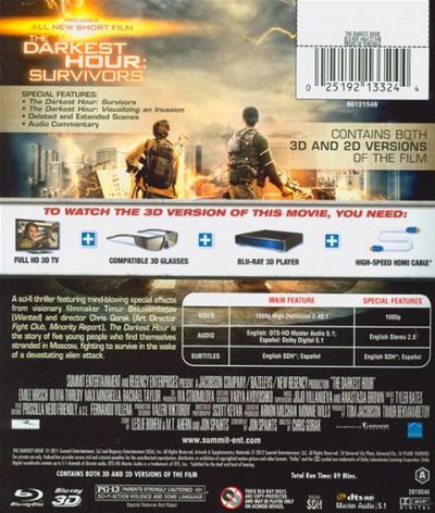 A Sci-fi thriller featuring mind-blowing special effects from the minds of visionary filmmaker Timur Bekmambetov (Wanted) and director Chris Gorak (Art Director, Fight Club, Minority Report),The Darkest Hour is the story of five young people who find themselves stranded in Moscow, fighting to survive in the wake of a devastating alien attack. |