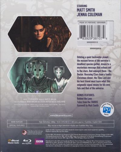 •Behind the Lens: It's Christmas! A time for peace and goodwill to all. But hang on, its Doctor Who, surely it can't be that simple? We take a peek behind the lens on this cracker of a Christmas special. The tinsel is out at the Oswald's and we meet a familiar enemy in a new form. The Doctor comes face to face with the enigmatic Tasha Lem and makes a new friend. With Matt Smith, Orla Brady, Jenna Coleman, Steven Moffat, Danny Hargreaves, Jack Hollington, Sheila Reid, James Buller and Elizabeth Rider. •Farewell to Matt Smith: Narrated by Alex Kingston (River Song), This compelling, hour-long special looks back at Matt Smith's extraordinary tenure as the Eleventh Doctor, featuring highlights from the show and copious interview footage with Matt, his cast-mates, writers, producers, guest stars and celebrity Doctor Who fans. •Tales from the TARDIS: A look back at the full, 50-year history of the iconic series. Eleventh Doctor Matt Smith and past Doctors David Tennant, Sylvester McCoy, Colin Baker, Peter Davison and Tom Baker tell what it was like to be the Doctor, how they got the job and how it changed their lives. With companions Jenna Coleman, Karen Gillan, Arthur Darvill, and more, this truly insightful special offers a unique insight into the world's longest running sci-fi series. |