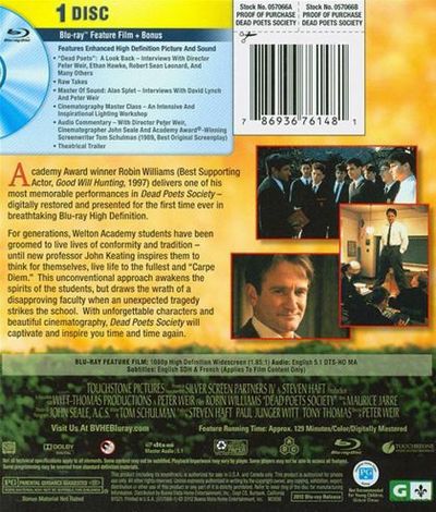 Dead Poets: A Look Back - Interviews with Director Peter Weir, Ethan Hawke, Robert Sean Leonard and Many Others Raw Takes Master Of Sound: Alan Splet - Interviews with David Lynch and Peter Weir Cinematography Master Class - An Intensive and Inspirational Lighting Workshop Audio Commentary - With Director Peter Weir, Cinematographer John Seal and Academy Award-Winning Screenwriter Tom Schulman (1989, Best Original Screenplay) Theatrical Trailer |