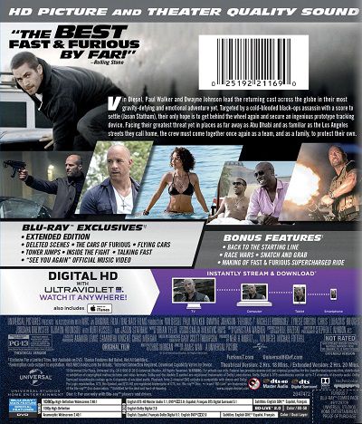 Continuing the global exploits in the unstoppable franchise built on speed, Vin Diesel, Paul Walker and Dwayne Johnson lead the returning cast of Fast & Furious 7. James Wan directs this chapter of the hugely successful series that also welcomes back favorites Michelle Rodriguez, Jordana Brewster, Tyrese Gibson, Chris "Ludacris" Bridges, Elsa Pataky and Lucas Black. They are joined by international action stars new to the franchise including Jason Statham, Djimon Hounsou, Tony Jaa, Ronda Rousey and Kurt Russell. |