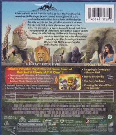 * Playable PlayStation 3 Game Demo of Ratchet & Clank: All 4 One - Featuring 45 Minutes of Gameplay - Play along or with up to 3 other friends as Rachet, Clank, Qwark, or Dr Nefarious * Deleted Scenes * The Cast of Zookeeper * Behind the Stunts * Be the Bear * Movie IQ * Laughing is Contagious Blooper Reel * Bernie the Gorilla * The Furry Co-Stars * Creating the Visual Effects - the Animals * |