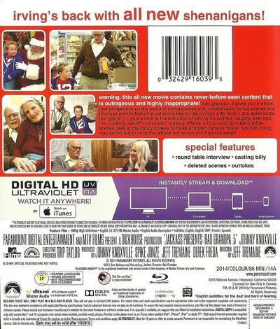 warning: this all new movie contains never-before-seen content that is outrageous and highly inappropriate! BAD GRANDPA .5 gives you a whole new perspective on the world of irving zisman with unbelievable bonus scenes and hilarious pranks featuring catherine keener (as irving's wife "ellie") and spike jonze (as "gloria")... plus a look at the evolution of johnny knoxville's naughty alter-ego, the academy award nominated makeup effects, and an exclusive behind-the-scenes peek at the idiocy it takes to make a hidden camera movie in public. irving may be too old to chop the lettuce but he can still toss the salad! |