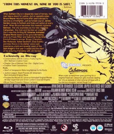 When Gotham City is in desperate need of heroes, two men take a stand for justice . . . but on opposite sides. Bruce Wayne returns home after years abroad to become a crimefighter, just as honest cop Lt. James Gordon moves to Gotham and finds corruption at every level. When Bruce becomes the masked vigilante Batman, the city explodes as his new nemesis Catwoman, the mob and Gordon all close in! Don't miss this thrilling DC Universe Animated Original Movie based on the groundbreaking story by Frank Miller and featuring three-time Emmy Award-winner Bryan Cranston, Ben McKenzie, Katee Sackhoff, Eliza Dushku and Alex Rocco in its stellar voice cast. Experience a bold and dynamic vision of the Dark Knight's first year in action and the start of his enduring friendship with Jim Gordon.