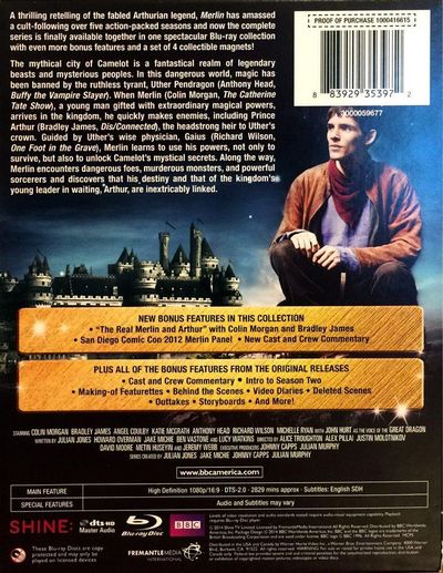 Merlin is a British fantasy-adventure television programme created by Julian Jones, Jake Michie, Julian Murphy, and Johnny Capps, starring Colin Morgan in the title role. It was broadcast on BBC One from 20 September 2008 to 24 December 2012 for a total of 65 episodes. The show is loosely based on the Arthurian legends of the young wizard Merlin and his relationship with King Arthur, but it differs from traditional versions. The show was influenced by the US drama series Smallville about the early years of Superman,[3] and was produced by independent production company Shine Limited. The show was picked up by the BBC in 2006 after unsuccessful attempts. The series premiered in 2008 to mixed reviews but good ratings which improved as the series went on, and proved popular on the BBC's digital catch-up service iPlayer. It was shown in the United States on NBC, though it later moved to the cable network Syfy. It is a mainstay in both Netflix US and UK. Merlin is a reimagining of the legend in which the future King Arthur and Merlin are young contemporaries. Arthur's father Uther Pendragon has banned magic in Camelot, its use punishable by death, forcing Merlin to keep his magical powers secret from everyone in Camelot other than his mentor Gaius. Arthur grows from a young, self-absorbed boy to the mighty king in the legends, and Merlin develops into his colossal role in creating the powerful Camelot. The series was immensely popular and very well received by the public. It was responsible for bringing much of the young cast to international prominence and transformed their careers. In 2012, the show's producers announced that its fifth series would be its last, with a two-part finale on 24 December 2012. Merlin still holds a major following, years after the final airing of the show.