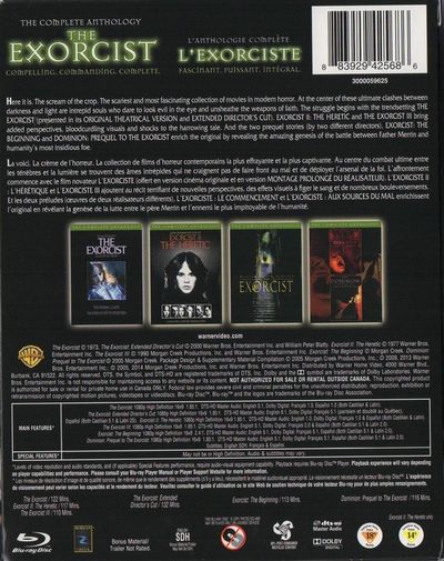 Here it is. The scream of the crop, The scariest and most fascinating collection of movies in modern horror. At the center of these ultimate clashes between darkness and light are intrepid souls who dare to look evil in the eye and unsheathe the weapons of faith. The struggle begins with the trendsetting The Exorcist (presented in it's Original Theatrical Version and Extended Director's Cut). Exorist II: The Heretic and The Exorcist III bring added perspectives, bloodcudling visuals and shocks to the harrowing tale. And the two prequel stories (by two different directors), Exorcist: The Beginning and Dominion: Prequel To The Exorcist enrich the original by revealing the amazing genesis of the battle between Father Merrin and humanity's most insidious foe.