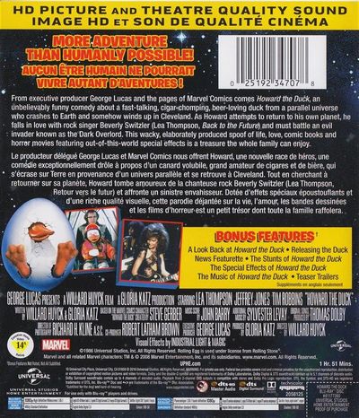 From executive producer George Lucas and the pages of Marvel Comics comes Howard the Duck, an unbelievably funny comedy about a fast-talking, cigar-chomping, beer-loving duck from a parallel universe who crashes to Earth and somehow winds up in Cleveland. As Howard attempts to return to his own planet, he falls in love with rock singer Beverly Switzler (Lea Thompson, Back to the Future) and must battle an evil invader known as the Dark Overlord. This wacky, elaborately produced spoof of life, love, comic books and horror movies featuring out-of-this-world special effects is a treasure the whole family can enjoy.