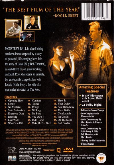 Monster's Ball is a hard-hitting Southern drama tempered by a story of powerful, life-changing love. It is the story of Hank (Billy Bob Thornton), an embittered prison guard working on Death Row in rural Georgia. He begins an unlikely bu emotionally charged affair with Leticia (Halle Berry, Winner of the 2001 Best Actress Academy Award), the wife of a man he has just executed. |