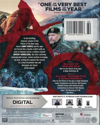 Caesar and his apes are forced into a deadly conflict with an army of humans led by a ruthless Colonel. After the apes suffer unimaginable losses, Caesar wrestles with his darker instincts and begins his own mythic quest to avenge his kind. As the journey finally brings them face to face, Caesar and the Colonel are pitted against each other in an epic battle that will determine the fate of both their species and the future of the planet. |