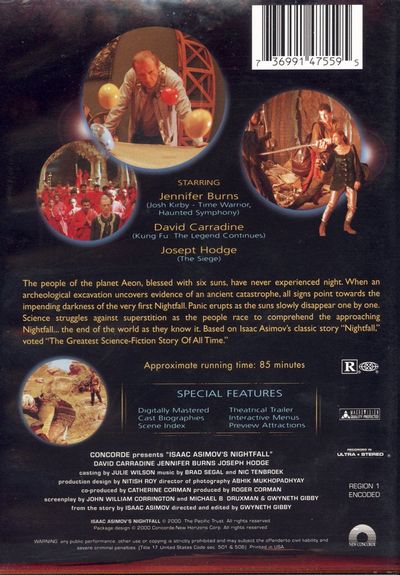 The people of the planet Aeon, blessed with six suns, have never experienced night. When an archeological excavaction uncovers evidence of an ancient catastrophe, all signs point towards the impending darkness of the very first Nightfall. Panic erupts as the suns slowly disappear one by one. Science struggles against superstition as the people race to comprehend the approaching Nightfall...the end of the world as they know it. Based on Isaac Asimov's classic story "Nightfall," voted "The Greatest Science-Fiction Sotry Of All Time" |