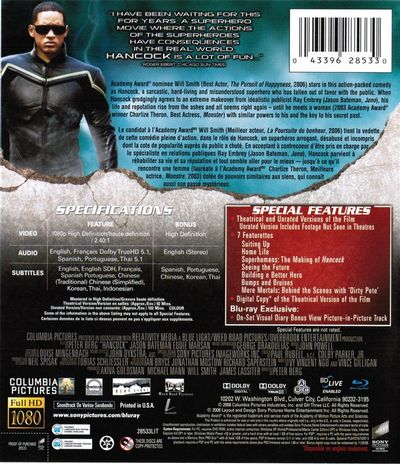 Academy Award nominee Will Smith (Best Actor, The Pursuit of Happyness, 2006) stars in this action-packed comedy as Hancock a sarcastic, hard-living and misunderstood superhero who has fallen out of favor with the public. When Hancock grudgingly agrees to an extreme makeover from idealistic publicist Ray Embrey (Jason Bateman, Juno), his life and reputation rise from the ashes and all seems right again – until he meets a woman (2003 Academy Award winner Charlize Theron, Best Actress, Monster) with similar powers to his secret past.Le candidat à l’academy Award Will Smith (Meilleur acteur, la poursuite du Bonheur, 2006) tient la vedette de cette comédie pleine d’action, dans le rôle de Hancock, un superhéros arrogant, désabusé et incompris dont la cote de popularité auprès du public a chuté. En acceptant à contrecoeur d’être pris en charge par le spécialiste en relations publiques Ray Embrey (Jason Bateman, Juno), Hancock parvient à réhabiliter sa vie et sa réputation et tout semble allez pour le mieux – jusqu’à ce qu’il rencontre une femme (lauréate de l’Academy Award Charlize Theron, meilleure actrice, Monstre, 2003) dote de pouvoirs similaires aux siens, qui connaît aussi son passé mystérieux.