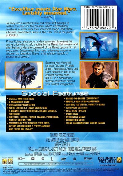 Journey into a mystical time and place that belongs to neither the past nor the present, where extraodinary creatures of myth work their incredible magic, and where a horrific, omnipotent Beast is the ruler. This is the planet of KRULL!Prince Colwyn sets out on a daring mission to rescue his young bride who is held captive by the Beast. But slayers and alien beings under the command of the Beast oppose him at every turn. Colwyn must first reach a fareway cavern to recover the legendary Glaive, a flying blade capable of phenomenal powers.Starring Ken Marshall, Lysette Anthony, Freddie Jones, Francesca Annis and Liam Neeson in one of his earliest screen roles, KRULL is a spectacular fantasy-adventure beyond your wildest imagination.