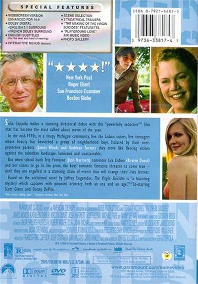 Sofia Coppola makes a stunning directorial debut with this "powerfully seductive" film that has become the most talked about movie of the year.In the mid-1970s, in a sleepy Michigan community, live the Lisbon sisters, five teenagers whose beauty has bewitched a group of neighborhood boys. Isolated by their overprotective parents (James Woods and Kathleen Turner), they move like fleeting visions against the suburban landscape, luminous and unattainable.But when school hunk Trip Fontaine (Josh Hartnett) convinces Lux Lisbon (Kirsten Dunst) and her sisters to go to the prom, the boys' romantic fantasies threaten to come true -- until they are engulfed in a stunning chain of events that will change their lives forever.Based on the acclaimed novel by Jeffrey Eugenides, The Virgin Suicides is "a haunting mystery which captures with pinpoint accuracy both an era and an age." |