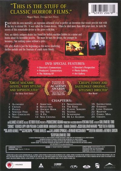 Faced with his own mortality, and ingenious alchemist tried to perfect an invention that would provide him with the key to eternal life. It was called the Cronos device. When he died more then 400 years later, he took the secrets of his remarkable device to the grave with him.Now, an elderly antiques dealer has found the hellish machine hidden in a statue and learns about its incredible powers. The more he uses the device, the younger he becomes... but nothing comes without a price.Life after death is just the beginning as this nerve-shattering thriller unfolds and the fountain of youth turns bloody |