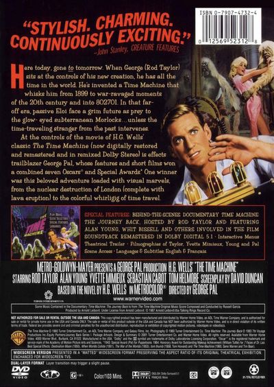Here today, gone to tomorrow. When George (Rod Taylor) sits at the controls of his new creation, he has all the time in the world. He's invented a Time Machine that whisks him from 1899 to war ravaged moments of the 20th century and into 802701. In that far-off era, passive Eloi face a grim future as prey to the glowing subterranean Morlocks...unless the time-traveling stranger from the past intervenes.At the controls of the movie H.G. Wells' classic 'The Time Machine' (now digitally restored and remastered and in remixed Dolby Stereo) is effects trailblazer George Pal, whose features and short films won a combined seven Oscars® and Special Awards. One winner was this beloved adventure loaded with visual marvels, from the nuclear destruction of London (complete with lava eruption) to the colorful whirligig of time travel.