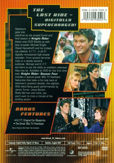 Adventure goes into overdrive as the amped fourth and final season of Knight Rider blasts onto DVD! Buckle up with lone crusader Michael Knight (David Hasselhoff) and his tricked-out sidekick, K.I.T.T., in all 21 digitally remastered high-octane episodes. From ancient terrorist cults to a deadly bacteria outbreak, Michael and K.I.T.T. are there to put the skids on evildoers wherever they may be. Available on DVD for the first time ever, Knight Rider: Season Four includes a special great '80s TV flashback featurette that takes a fun look back at television's greatest decade, the eighties. With electrifying guest performances by Janine Turner, Lance Burton, Shelly Berman and more, you won't want to miss a minute of the thrilling action! |