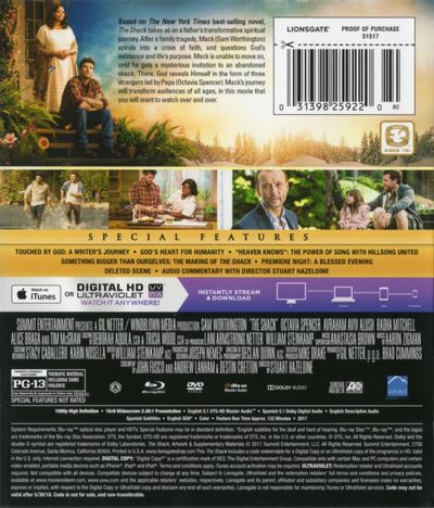 Based on The New York Times best-selling novel, The Shack takes us on a father's tranformative spiritual journey. After a family tragedy, Mack (Sam Worthington) spirals into a crisis of faith, and questions God's existence and life's purpose. Mack is unable to move on, until he gets a mysterious invitation to an abandoned shack. There, God reveals Himself in the form of three strangers led by Papa (Octavia Spencer). Mack's journey will transform audiences of all ages, in this movie that you will want to watch over and over. |