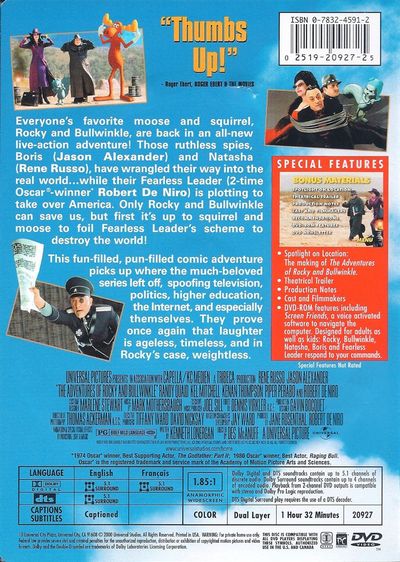 Everyone's favorite moose and squirrel, Rocky and Bullwinkle, are back in an all-new live-action adventure! Those ruthless spies, Boris ('Jason Alexander') and Natasha ('Rene Russo'), have wrangled their way into the real world...while their Fearless Leader (2-time Oscar®-winner* 'Robert De Niro') is plotting to take over America. Only Rocky and Bullwinkle can save us, but first it's up to squirrel and moose to foil Fearless Leader's scheme to destroy the world!This fun-filled, pun-filled comic adventure picks up where the much-beloved series left off, spoofing television, politics, higher education, the Internet, and especially themselves. They prove once again that laughter is ageless, timeless, and in Rocky's case, weightless.*1974 Oscar® winner, Best Supporting Actor, 'The Godfather: Part II'; 1980 Oscar® winner, Best Actor, 'Raging Bull'. |