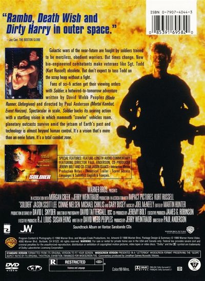 "Rambo, Death Wish and Dirty Harry in outer space." - Jay Carr, The Boston GlobeGalactic wars of the near-future are fought by soldiers trained to be merciless, obedient warriors. But times change. New bio-engineered combatants make veterans like Sgt. Todd (Kurt Russell) absolete. But don't expect to toss Todd on the scrap heap without a fight.Fans of sci-fi action get their viewing orders with Soldier, a hotwired-to-tomorrow adventure written by David Webb Peoples (Blade Runner, Unforgiven) and directed by Paul Anderson (Mortal Combat, Event Horizon). Spectacular in scale. Soldier backs its searing action with a startling vision in which mammoth "crawler" vehicles roam, planetary outcasts survive amid the jetsam of Earth's past and technology is almost beyond human control. It's a vision that's more than an eerie future. It's a total combat zone.