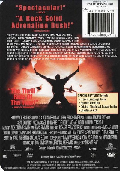 Hollywood superstar Sean Connery (The Hunt For Red October) joins Academy Award™ winner Nicolas Cage (1995 Best Actor - Leaving Las Vegas) in the action-packed thriller of the year, The Rock! All of San Francisco is taken hostage when a vengeful General (Ed Harris - Apollo 13) seizes control of Alcatraz Island, threatening to launch missiles loaded with deadly poison gas! With time running out, only a young FBI chemical weapons expert (Cage) and a notorious Federal prisoner (Connery) have the skills to penetrate the island fortress and defuse the lethal situation! Edge-of-your-seat suspense and unstoppable action explode off the screen in this must-see motion picture event! |