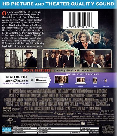 Oscar winner Rachel Weisz stars in this powerful true story based on the acclaimed book, Denial: Holocaust History on Trial. When Deborah Lipstadt (Weisz) speaks out against Holocaust denier David Irving (Timothy Spall) over his falsification of history, she discovers that the stakes are higher than ever in the battle for historical truth. Now faced with a libel lawsuit in British court, Lipstadt and her attorney (Tom Wilkinson) have the heavy burden of proving that the Holocaust actually happened, in a riveting legal fight with stunning consequences.