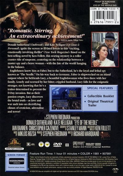Englishmen know him as Faber, but to the Fatherland, he's the loyal and lethal spy known as "The Needle". On his way back to Germany, Faber is shipwrecked on an island outpost where he befriends Lucy, a beautiful Englishwoman who lives there with her family. Lonely and scorned by her bitter, crippled husband, Lucy falls for the enigmatic stranger, not knowing that he's a traitor determined to prevent the D-Day invasion. But as their passion erupts, Lucy discovers the brutal truth - as love and war melt into an electryfing climax of eroticism, adrenaline and terror!